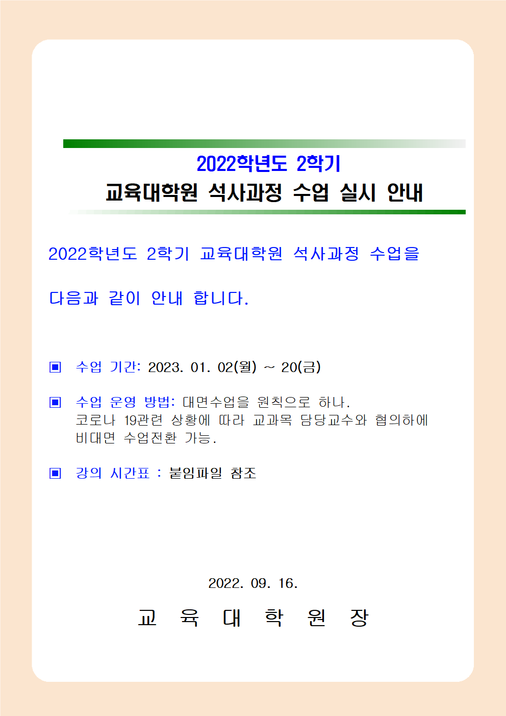 2022학년도 2학기 교육대학원 수업 실시 안내