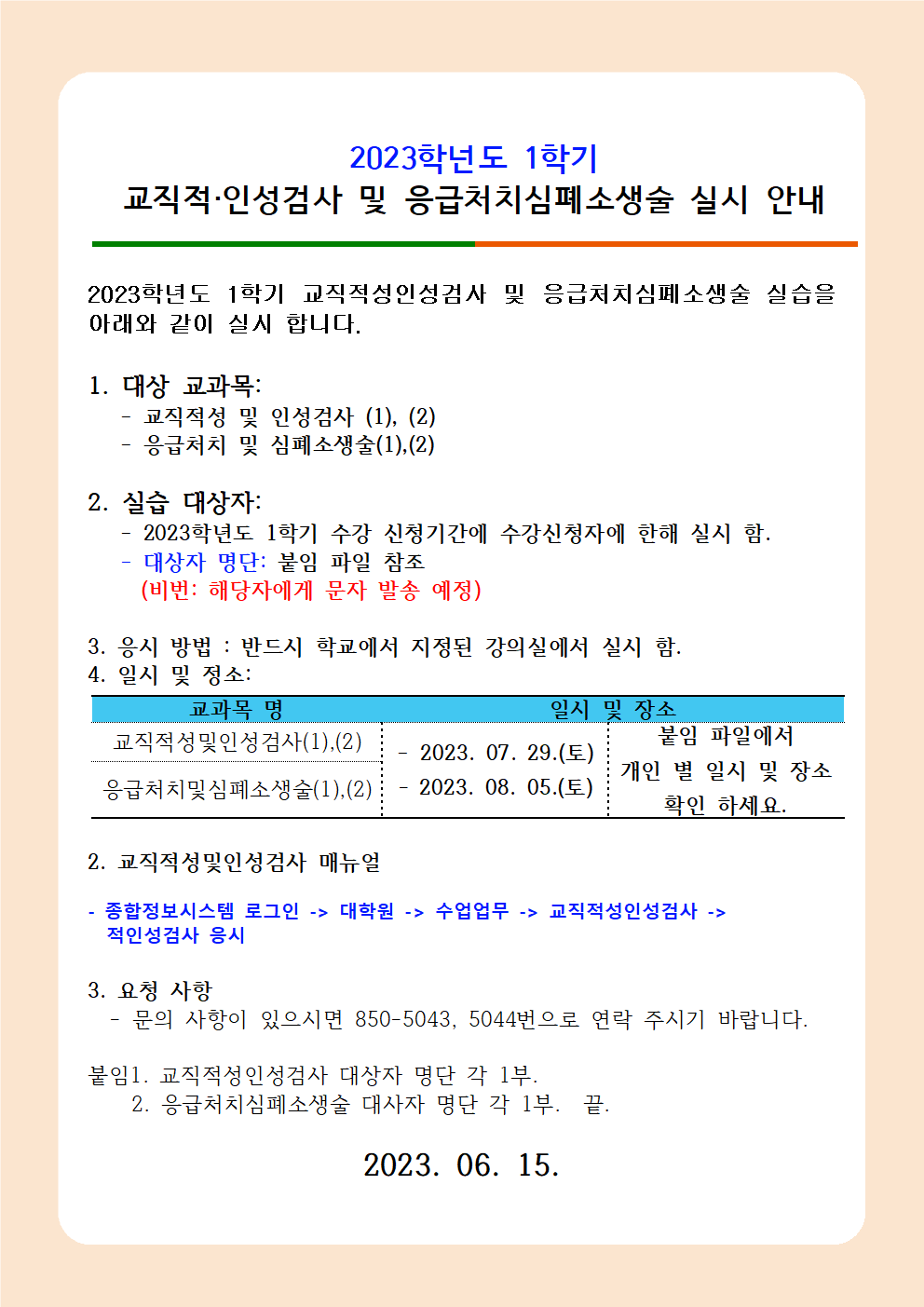 2023학년도 1학기 교직 적성인성검사 및 응급처치심폐소생술 실시 안내