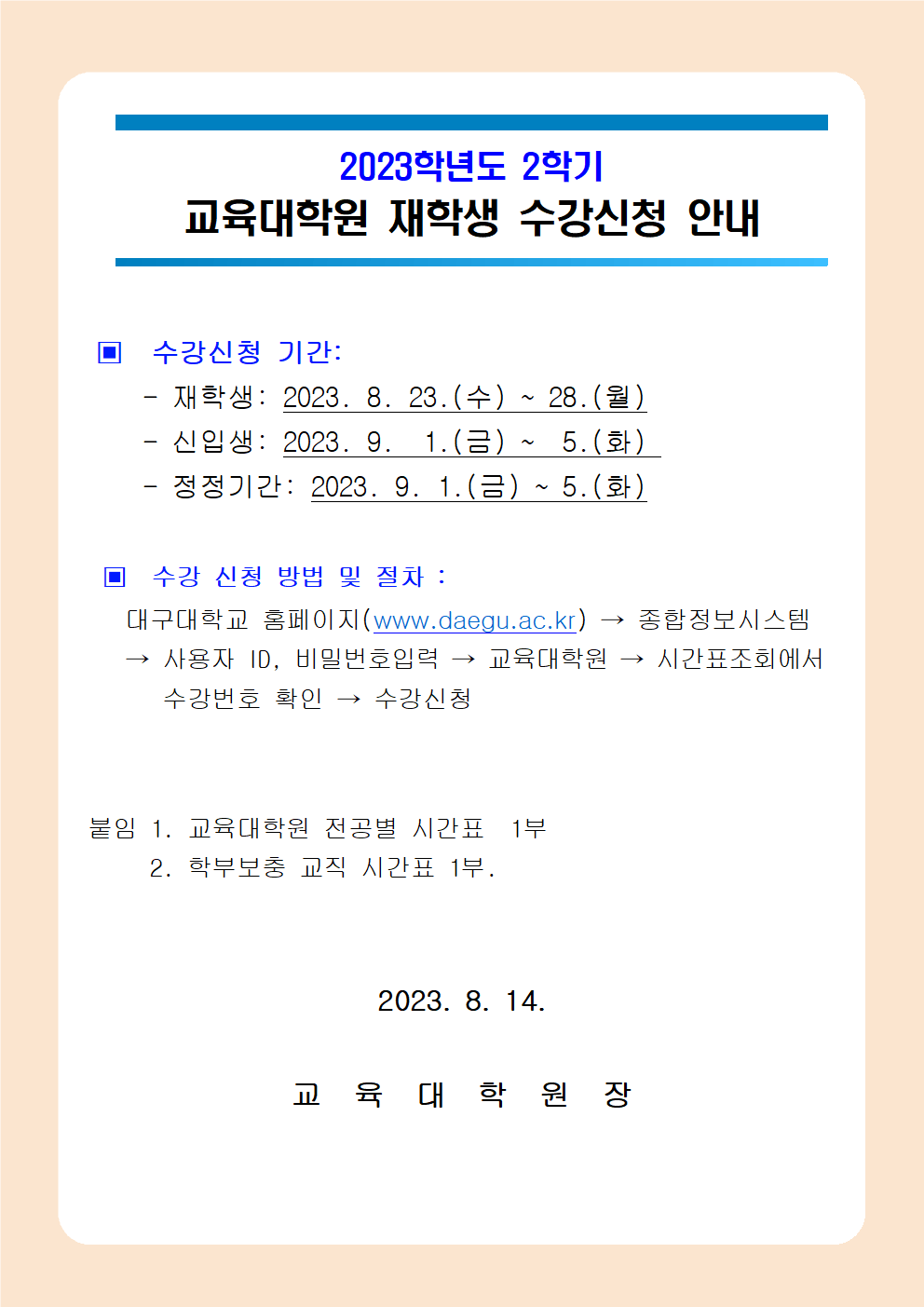 2023학년도 2학기 교육대학원 재학생 수강신청 기간 안내