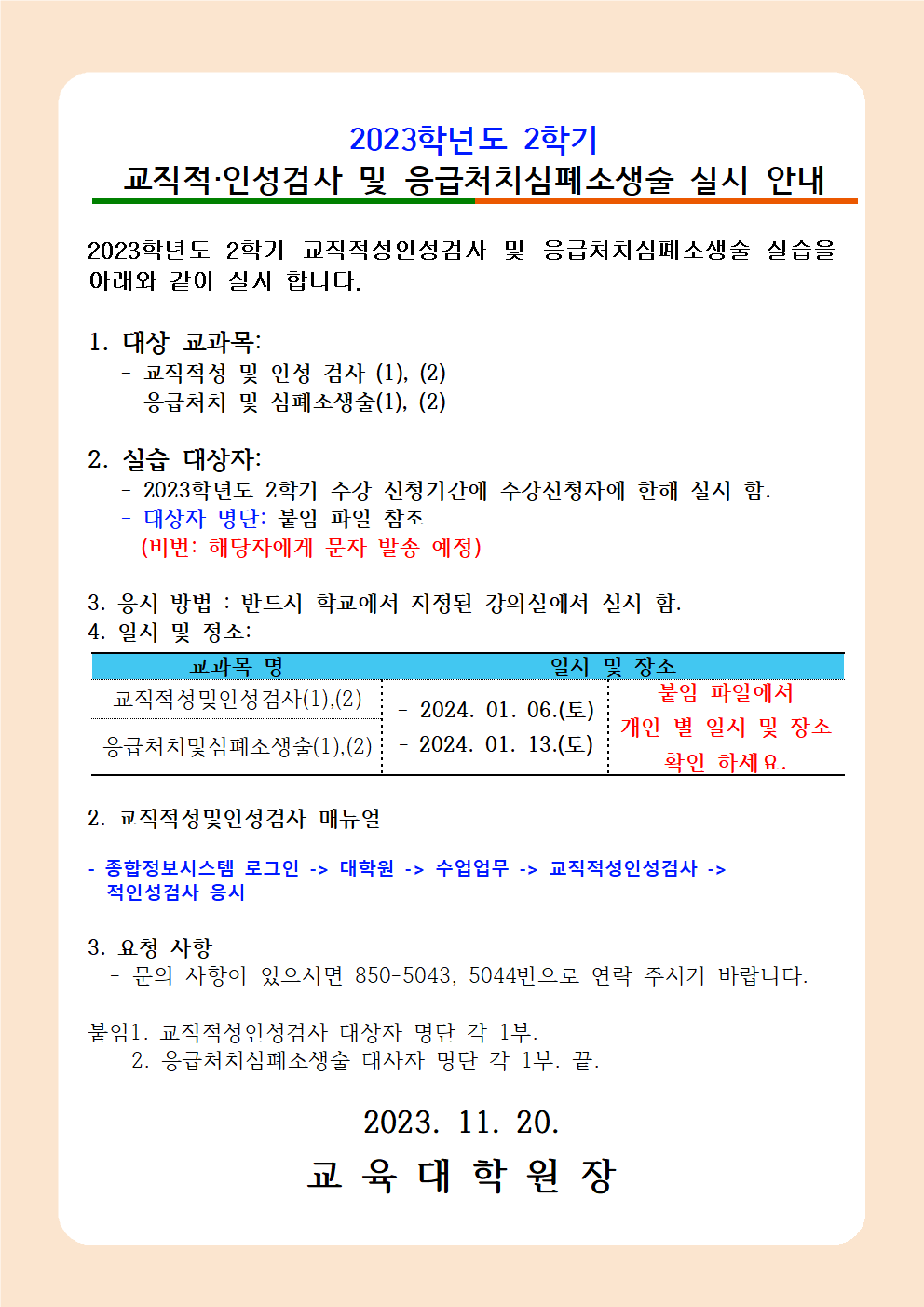 2023학년도 2학기 교직 적성인성 검사 및 응급처치심폐소생술 실시 안내