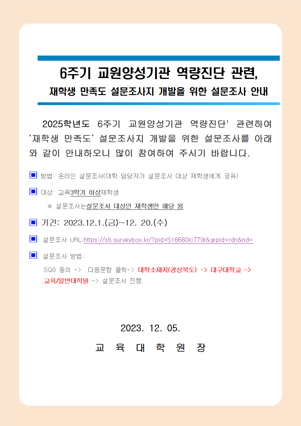 6주기 교원양성기관 역량진단 관련 재학생 만족도 설문조사지 개발을 위한 설문조사 안내