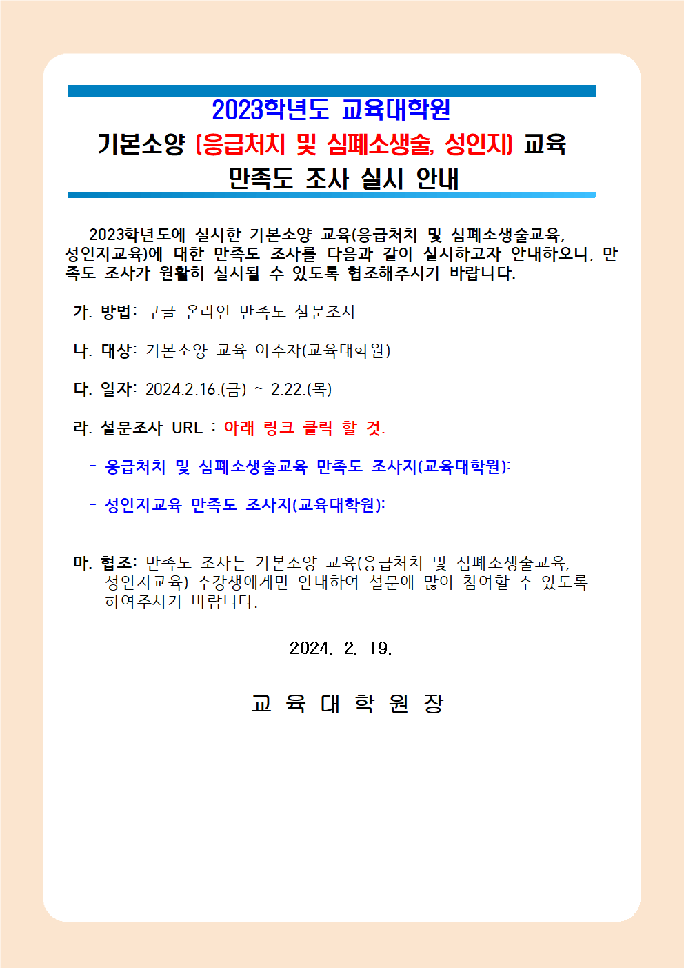 2023학년도 교육대학원 기본소양[응급처치 및 심폐소생술, 성인지] 교육 만족도 조사 실시 안내