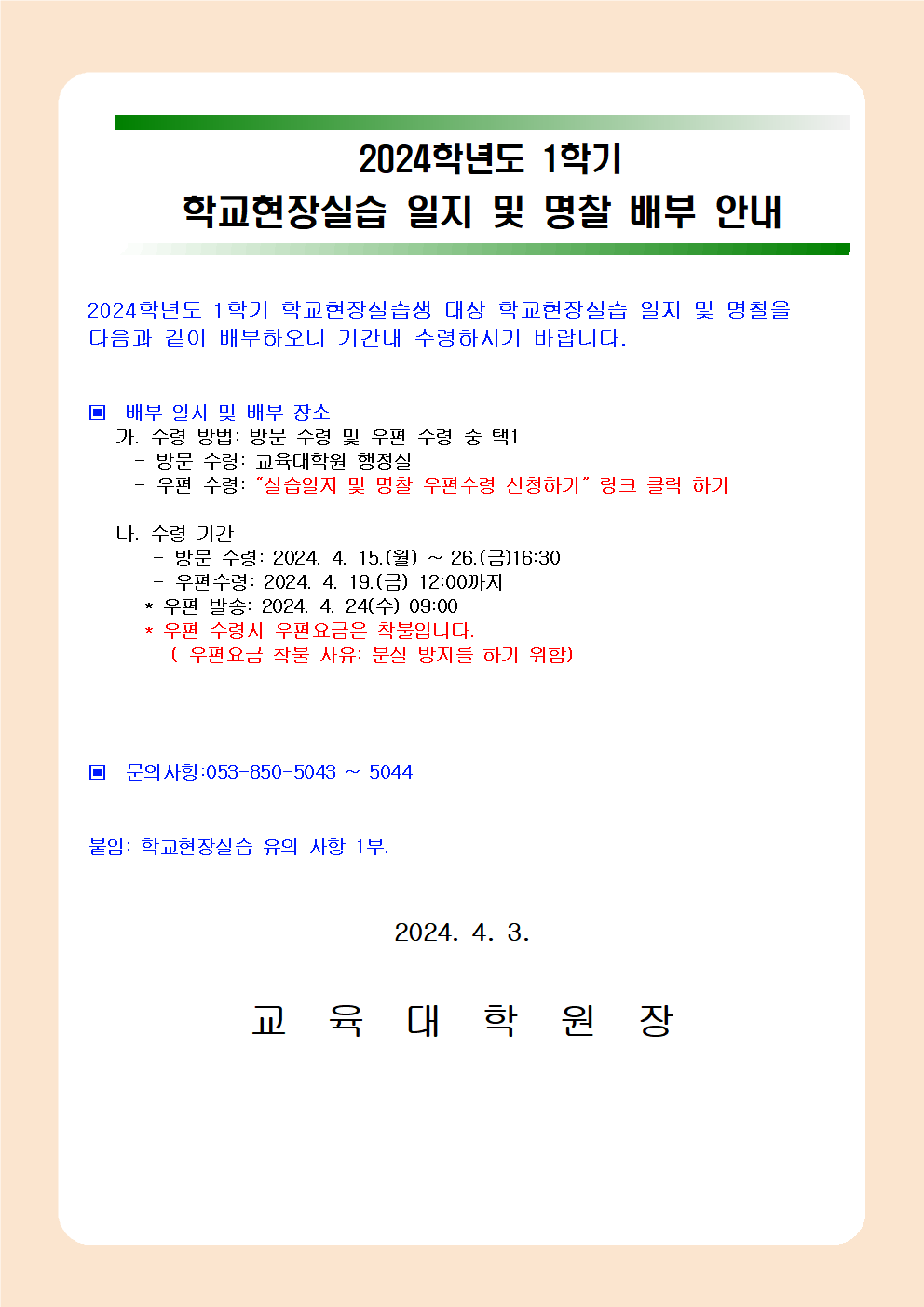 2024학년도 1학기 학교현장실습 일지 및 명찰 배부 안내