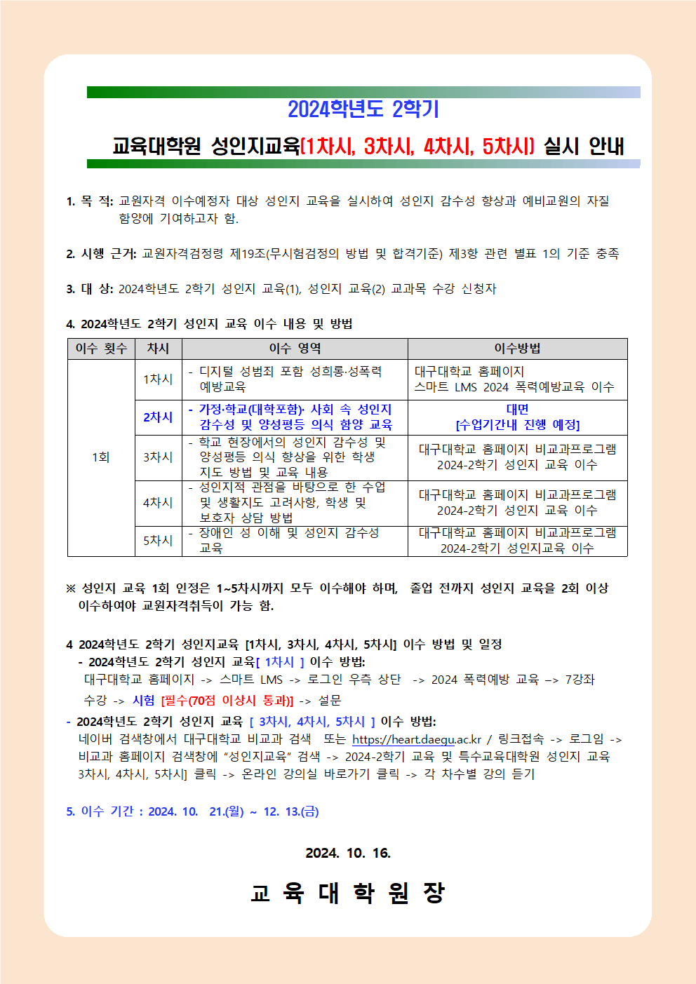 2024학년도 2학기 교육대학원 성인지 교육[1차시, 3차시, 4차시, 5차시] 실시