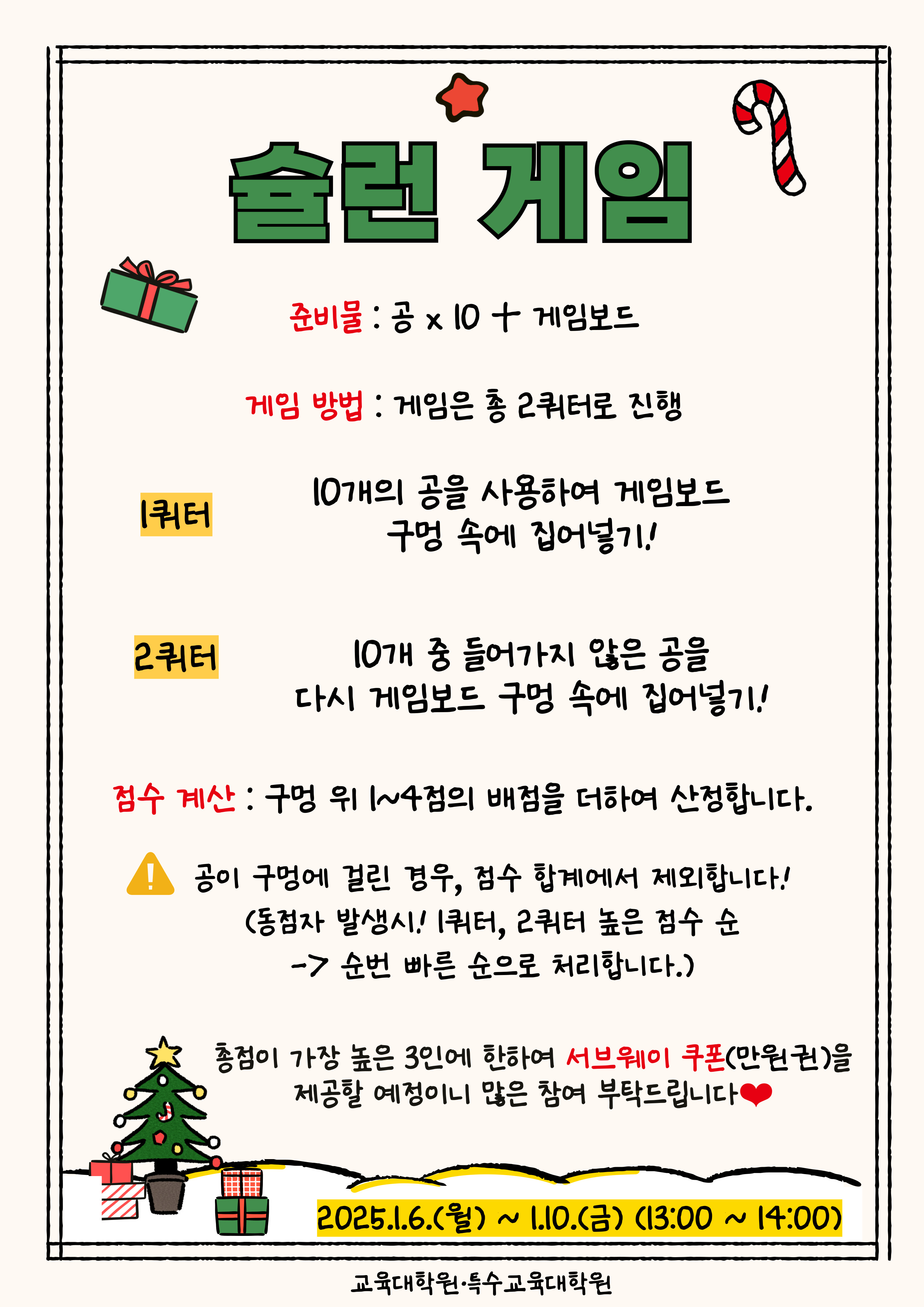 ** 1,2,3등은 교육대학원 행정실로 오셔서 서브웨이 쿠폰(10,000원)을 수령해 가시기 바랍니다.