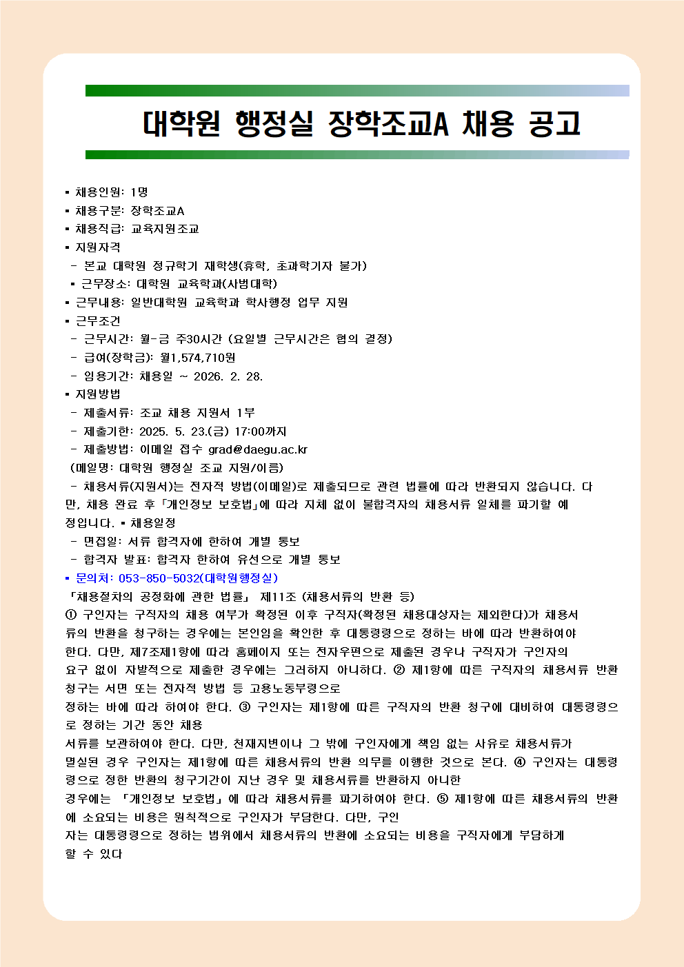 일반대학원 행정실 장학조교 A 채용 공고