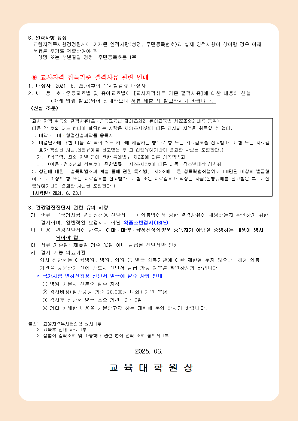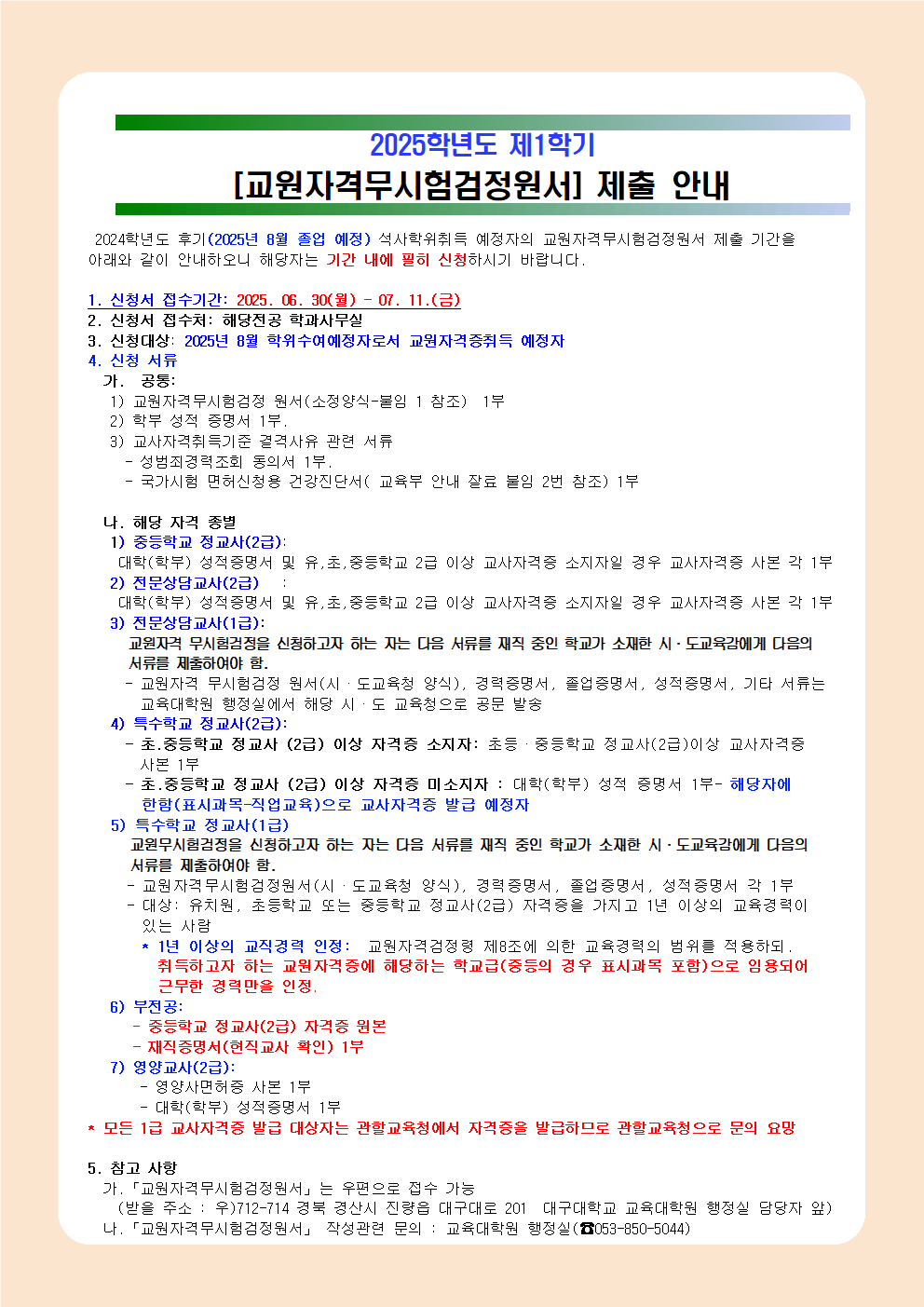2025학년도 1학기 교원자격무시험검정원서 제출 안내