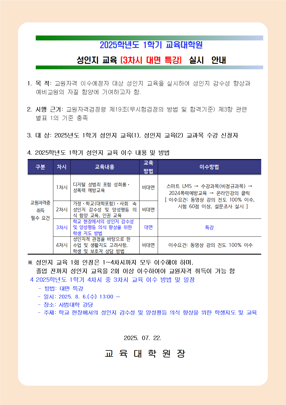 2025학년도 1학기 성인지 교육 3차시[대면 특강] 실시 안내