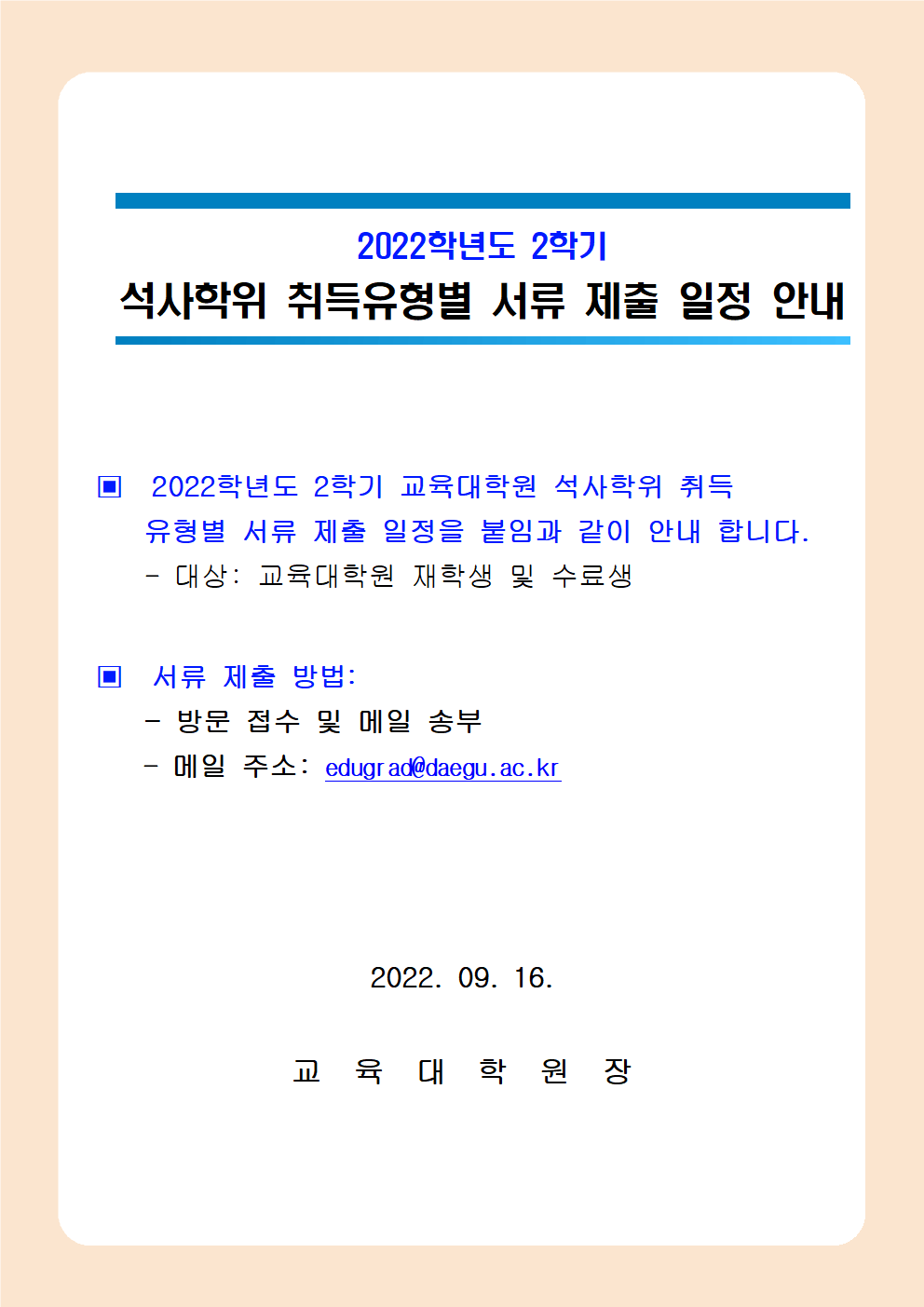 2022학년도 2학기 교육대학원 석사유형별 서류 제출 일정