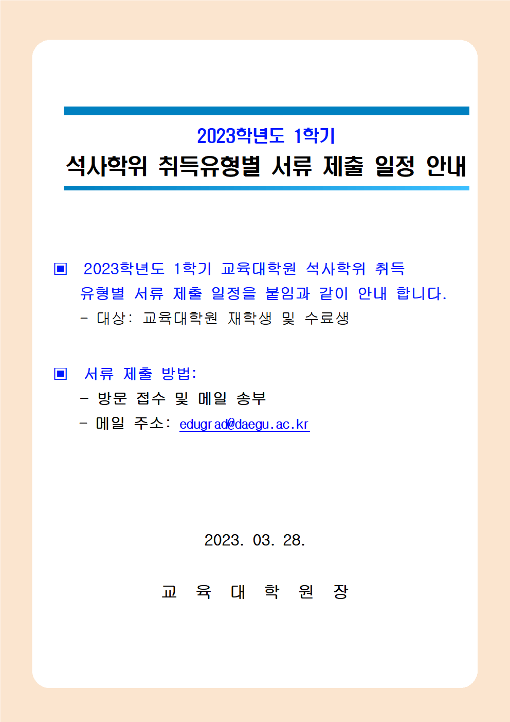 2023학년도 1학기 석사학위 취득 유형별 서류 제출 일정 안내